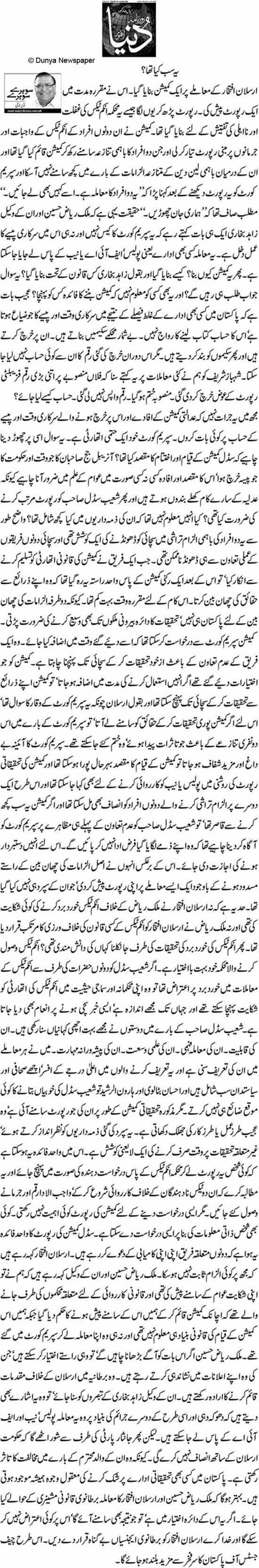 Lahore, News Desk (www.pakdestiny) Shoiab Suddle, the incharge of one-man commission which was dissolved by Supreme Court for the reason best known to it in fact acted like an Income Tax Officer (ITO) instead of investigate Arsalan’s receiving of Rs340 million from Riaz to ask his father Chief Justice Iftikhar Chaudhry to give property tycoon Riaz Malik ‘favour’ in the Bahria Town cases pending in his court.